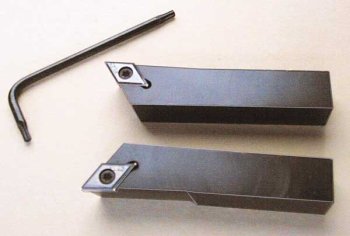 Carbide insert tooling has become the tooling of choice in most professional machine shops because it offers several advantages. They allow higher rates of metal removal because cutting speeds are higher. They are not sharpened, they are simply replaced when they become dull, saving time. They have more than one cutting surface, so when one surface gets chipped or dull, the insert is turned around and you have a new cutting face. Because only the small insert is replaced, they are cost effective. This set includes 3/8 shank holders that are offset 35° to the left and right. They take 55° inserts which offer a good combination of strength and the ability to get into corners. Each of the two holders comes with a carbide insert, and a special Torx screw to hold the insert in place. A Torx wrench to remove the screws is provided. Use of the holders requires the purchase of the P/N 7600 tool post which has a slot for 3/8 shank tools.